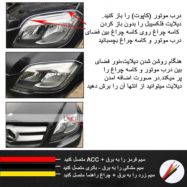 دیلایت انعطاف پذیر نئونی دو حالت محصولی بسیار جذاب و پرطرفدار است.این دیلایت به سادگی بر روی کاسه چراغ نصب میشود.به دلیل ضد آب بودن آن نیازی نیست کاسه چراغ باز شود و داخل کاسه چراغ نصب شود.این دیلایت بسیار نازک بوده و به همین دلیل بر روی کاسه چراغ در فاصله درب موتور و کاسه چراغ نصب میشود.دو طرف این دیلایت نئونی چسب آماده وجود دارد و به این صورت در عرض 5 دقیقه به راحتی میتوانید آن را نصب کنید.این دیلایت دارای راهنمای متحرکت میباشد به این معنی که وقتی راهنما را استفاده میکنید این دیلایت با افکتی خاص روشن و خاموش میشود.طول هر عدد از این دیلایت ها 60 سانتی متر میباشد که بر روی تمامی کاسه چراغ های خودروهای ایرانی و خارجی قابل نصب است.چنانچه هر مقدار از این دیلایت اضافه بیاید به راحتی از انتها میتوانید برش دهید.این دیلایت در مجموعه دو عددی میباشد یعنی دو دیلایت که هر کدام 60 سانتی متر میباشد.این دیلایت دارای 3 عدد سیم میباشد.سیم مشکی آن به برق منفی باتری - سیم قرمز آن به برق مثبت متصل میشود که باعث روشن شدن رنگ سفید دیلایت میشود و سیم نارنجی به برق مثبت راهنما متصل میشود.به این صورت هنگام زدن راهنما،رنگ سفید دیلایت خاموش میشود و با افکت متحرک رنگ نارجی شروع به چشمک زدن میکند.