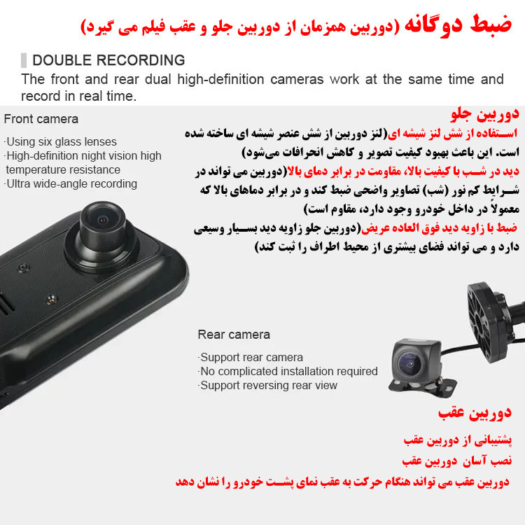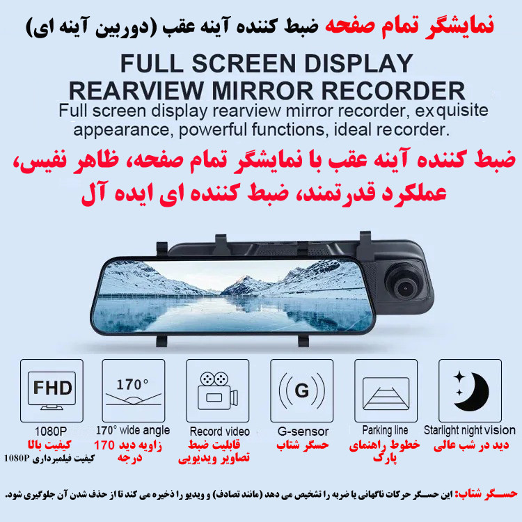آینه مانیتور دار خودرو مدل L1056 با قابلیت های ویژه یک محصول چند منظوره است که میتواند جایگزین آینه دید عقب سنتی شود و تجربه رانندگی ایمنتری را برای شما رقم بزند. این محصول با بهرهگیری از دوربینهای جلو Full HD و عقب با کیفیت HDامکان ضبط تصاویر واضح و شفاف را در هر شرایط نوری فراهم میکند. لنزهای شیشهای HD به کار رفته در این دوربینها با قابلیتهایی نظیر کاهش نور اضافی، تنظیم رنگ و حذف نویز، تصاویری با جزئیات دقیق و رنگهای زنده ارائه میدهند. آینه مانیتور دار خودرو با بهرهگیری از فناوری WDR ، عملکرد فوقالعادهای در شرایط نوری کم ارائه میدهد. با دید در شب میتوانید جزئیات دقیقی از محیط اطراف خود، حتی پلاک خودروها را در شب ثبت کنید. این ویژگی به شما کمک میکند تا در صورت بروز حادثه، شواهد کافی برای اثبات حقانیت خود داشته باشید. علاوه بر این، این محصول با ضبط چرخهای، نیازی به پاک کردن دستی ویدئوها نیست و دستگاه به طور خودکار ویدئوهای قدیمی را با ویدئوهای جدید جایگزین میکند. آینه مانیتور دار خودرو L1056 یک انتخاب هوشمندانه برای رانندگانی است که به دنبال ایمنی، راحتی و سرگرمی در حین رانندگی هستند.