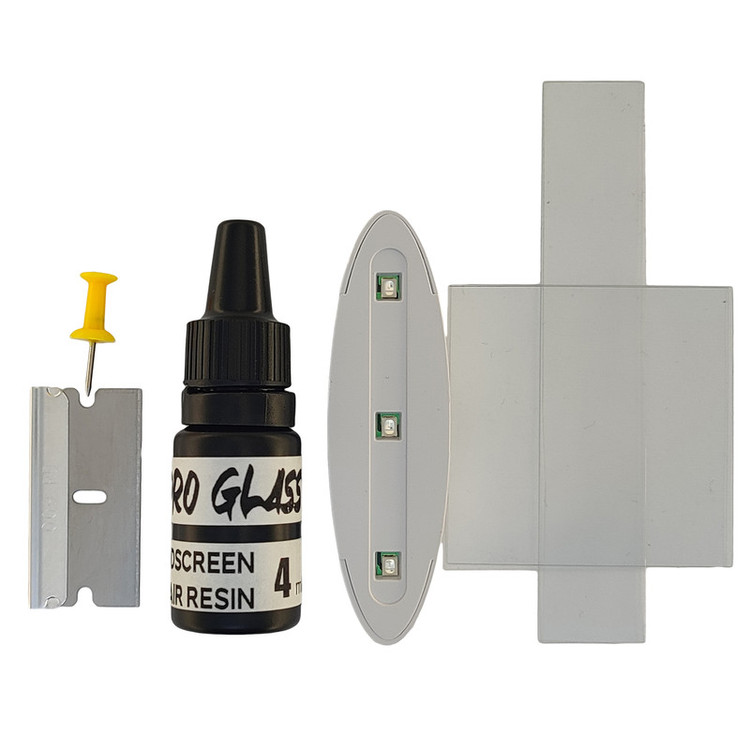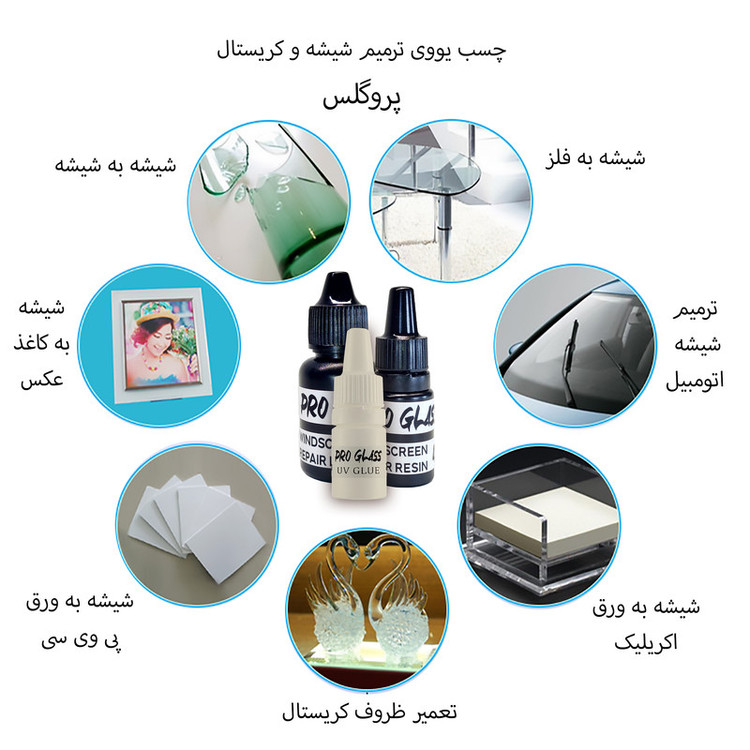 کیت ترمیم کننده شیشه پروگلس مناسب جهت ترمیم انواع ترک و سنگ خوردگی رزین داخل این پک به صورت ۱۰۰ درصد خالص از بهترین رزین یووی ایتالیایی موجود بسته بندی گردیده. این رزین مخصوص ترمیم شیشه و چسباندن شیشه به شیشه میباشد و بهترین گزینه برای استفاده در دستگاه های حرفه ای ترمیم شیشه نیز میباشد . این چسب فقط با تاباندن اشعه یووی (نور طبیعی آفتاب یا لامپ یووی) خشک میشود و در اثر مجاورت هوا و گرما بدون اشعه یووی به هیچ وجه عمل نمیکند این چسب برای تعمیر و چسباندن شیشه به فلزات، شیشه، سنگ، چوب ، ترمیم شیشه اتومبیل و … به کار می رود. مناسب برای چسباندن لوازم شیشه ای و تزئینی مثل لوستر و مجسمه های شیشه ای و ظروف کریستالی و چسباندن شیشه چراغ خودرو تعمیر انواع لوازم الکترونیکی مانند سیم و صفحات تعمیر نقره و چسباندن سنگهای تزئینی به فلز و زیور آلات پس از خشک شدن، در برابر آب، ماشین ظرف شویی، نور و حرارت مقاوم خواهد بود. این چسب در مقابل نور آفتاب نیز عمل می کند. این چسب کاملاً شفاف و کم بو است و در اثر تابش (مستقیم) نور لامپ یووی موجود در بسته بندی و در مدت ۱۰ الی ۳۰ ثانیه خشک می شود. همچنین پس از خشک شدن در برابر آب، ماشین ظرف شویی، نور و حرارت مقاوم خواهد بود. این چسب در مقابل نور آفتاب نیز عمل می کند این کیت شامل رزین یووی رقیق مخصوص شیشه حجم 4ml و لامپ یووی با ورودی type c و ۴ عدد طلق و سوزن و تیغ میباشد