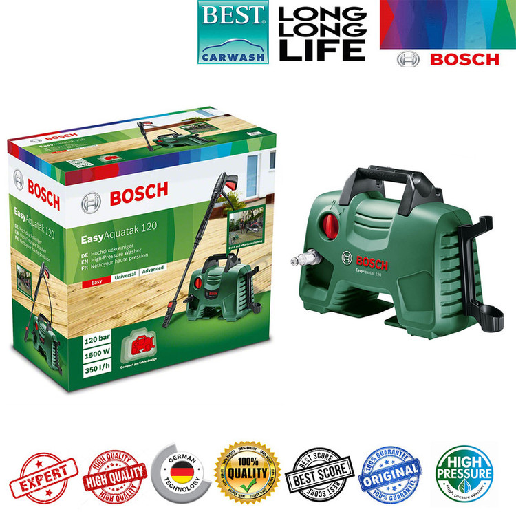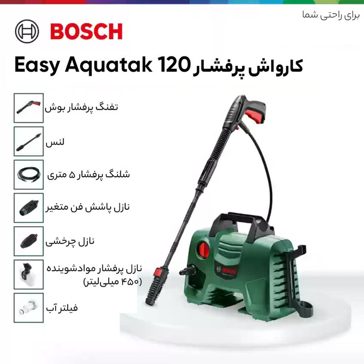 شرکت (Bosch) «بوش» یکی از بزرگترین و معروفترین شرکتهای تولید لوازم و دستگاههای خانگی و صنعتی است که سالهاست در این زمینه فعالیت میکند. اینروزها کمتر کسی است که نام این برند معروف را نشنیده باشد و از کیفیت محصولاتش بیخبر باشد. این شرکت یکی از جدیدترین محصولاتش را به نام کارواش بوش مدل Easy Aquatak 120 به بازار عرضه کرده است.کارواش بوش مدل Easy Aquatak 120 را میتوان محصولی تمام عیار از شرکت بوش آلمان دانست که همیشه در تولید ابزار آلات صنعتی در دنیا بی رقیب بوده است . کارواش بهصورت هوشمند عمل کرده و دارای سامانه توقف خودکار دستگاه است. این قابلیت باعث میشود تا هنگامی که کاربر با دستگاه کار نمیکند، دستگاه متوقف شده و در مصرف آب و برق صرفهجویی شود.این دستگاه توان بسیار بالایی برابر 1500 وات دارد که قادر است آب را با حداکثر فشار برابر 120 بار از نازل خود خارج کند. بزرگترین ویژگی این دستگاه کارواش پمپ تمام فلزی سه سیلندری آن می باشد . این دستگاه مجهز به سیستم پیشرفته فوم پاش و ساکشن می باشد . طول لنس این دستگاه 5 متر می باشد . بسیاری از موارد کیفی و زیبایی منحصر به فرد این دستگاه باعث شده این دستگاه در نوع خود در دنیا بی رقیب باشد .