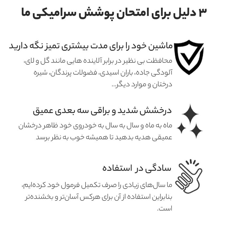 پوشش نانو سرامیک مستر فیکس، پوششی است که میتواند از بدنه خودرو شما در برابر عوامل خارجی که موجب آسیب رساندن به رنگ خودرو میشوند، محافظت کرده و در عین حال با ایجاد براقیت و قابلیت آبگریزی از کثیف شدن آن جلوگیری کند. پوشش نانوسرامیک با ایجاد لایهای محافظ با ضریب سختی 9H بر روی بدنه خودرو، آن را در برابر اشعه خورشید، بارانهای اسیدی، مواد شیمیایی و آلایندههای محیطی مقاوم میسازد و به کمک این پوشش دیگر نگران خشهای سطحی در بدنه خودرو نخواهید بود. همچنین قابلیت آبگریزی ایجاد شده به واسطه استفاده از این محصول، کمک میکند تا کمترین اثر از بارندگیهای بر روی خودرو باقی بماند و در نتیجه نیاز به شستوشو به مقدار قابل توجهی کاهش مییابد. در حال حاضر در بسیاری از مراکز، امکان انجام پوششهای نانوسرامیک مهیا میباشد اما هزینه قابل توجهی برای دارندگان خودرو خواهد داشت که کمک این محصول به سادگی میتوانید خودتان این کار را انجام دهید. تمامی لوازم مورد نیاز برای انجام این کار در بستهبندی موجود میباشد و تنها لازم است تا ابتدا خودرو را به خوبی بشوئید و سپس با استفاده از اسفنج و پارجه مخصوص پوشش مورد نظر را ایجاد کنید. پیشنهاد میشود برای نتیجهدهی مطلوب، پس از اعمال پوشش به مدت 48 ساعت به آن فرصت دهید تا به صورت طبیعی خشک شود. همچنین پیشنهاد میگردد تا پوشش را در محیطی سرپوشیده بر روی بدنه خودرو اعمال کنید تا تاثیر گرد و غبار محیطی، حداقل گردد.