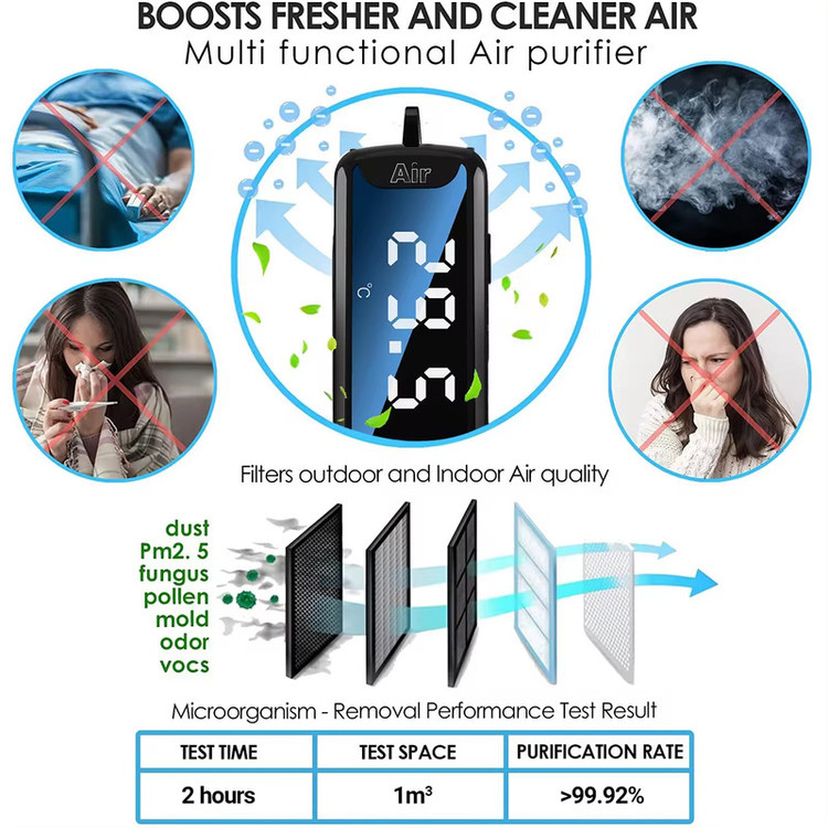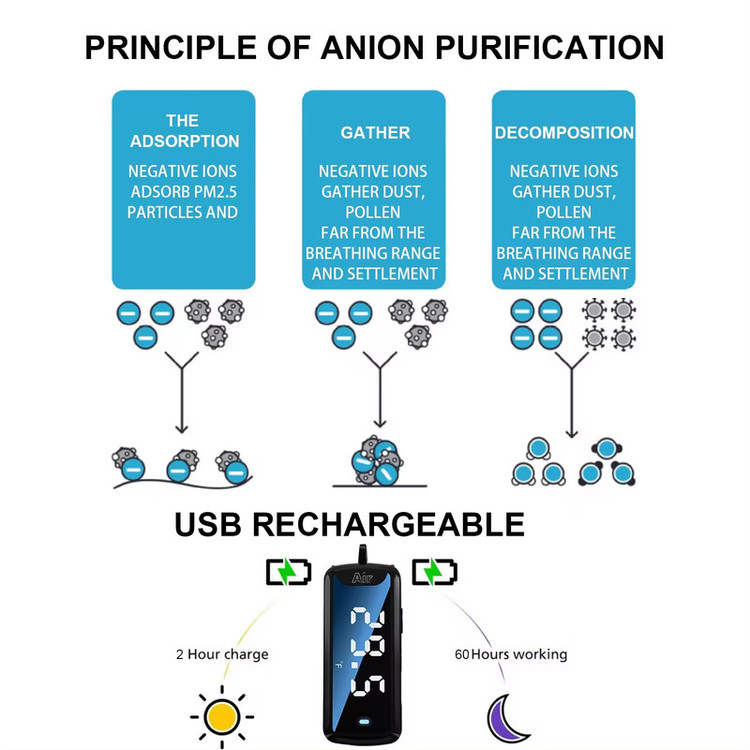 این تصفیهکننده با استفاده از فناوری پیشرفته و بدون تولید گاز اوزون، میلیونها یون منفی تولید کرده که آلایندههای مضر موجود در هوا را از منطقه تنفسی شما دور و در نتیجه کرهای از هوای پاکتر (بازدهی تا 1 متر مکعب) ایجاد میکند. این تصفیهکننده هوای پوشیدنی، بسیار سبک، کوچک و بیصدا است. مینی تصفیهکننده هوای پوشیدنی را میتوان در خانه و اداره ، اتاق خواب، آشپزخانه، سفر ، هواپیما، قطار، اتوبوس یا وسیله نقلیه استفاده کرد و فضای شخصی را از هوای تازهتر و تنفسپذیرتر، حتی در محیطهای شلوغ برای خود فراهم نمود. این دستگاه تصفیه هوای پوشیدنی، بدون نیاز به تعویض فیلتر بوده و برای دانشآموزان، معلمان، کارکنان مراقبتهای بهداشتی و غیره عالی است، به سادگی می توانید آن را شارژ کنید و بپوشید یا آن را به دریچه کولر اتومبیلتان متصل نمایید تا هوای داخل خودرو تصفیه گردد.یا در نزدیکی تخت خواب خود قرار دهید تا هوای اطراف بالش شما تمیز شود. این دستگاه درحین استفاده کاملا بدون سروصدا بوده و به اندازه کافی آرام است تا خواب، کار و مطالعه شما مختل نشود. همچنین دارای یک دماسنج دیجییتالی است که دمای محیط را در هر لحظه نمایش می دهد به طور کلی دستگاههای تصفیه هوا با توجه به سایز و مکان استفاده به مدلهای مختلفی تقسیم میشوند که شامل دستگاه تصفیه هوای خانگی ، دستگاه تصفیه هوای اداری ، دستگاه تصفیه هوای کارگاهی، دستگاه تصفیه هوای قابل حمل (مناسب خودرو) و دستگاه تصفیه هوای همراه میباشد.
