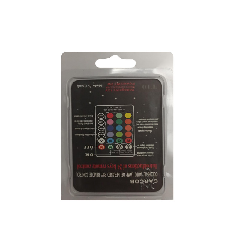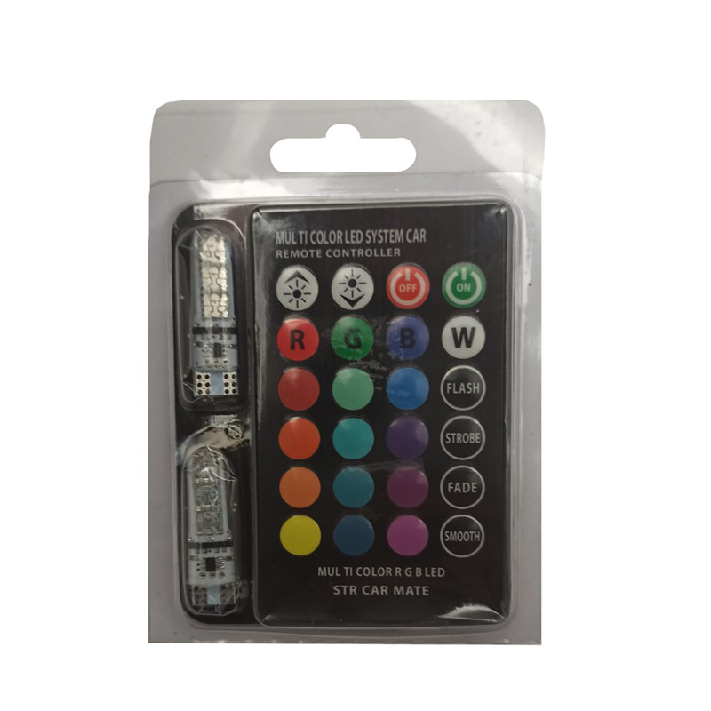 لامپ رنگی خودرو دارای دو لامپ LED و یه کنترل از راه دور است. این وسیله کوچک و سبک و کم حجم، دارای ولتاژ 12 ولت، توان 2 وات و جریان 0.16 آمپر است. همچنین دارای 24 کلید مختلف و 16 رنگ متنوع می باشد.خیلی ساده و راحت می توانید شدت نور رو تغییر بدهید و هر رنگی که مرود علاقه شماست را انتخاب کنید. دکمه خاموش و روشن و حالت چشمک زن هم دارد.